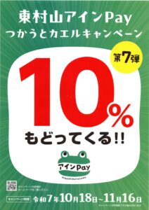 「東村山アインPay つかうとカエルキャンペーン第7弾」を 10月18日(土)から当店でも開催いたします!