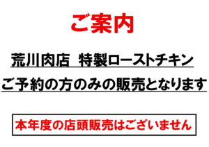 クリスマス ローストチキン販売状況について お知らせ 2025.12.24 「荒川肉店 特製 クリスマス限定 ローストチキン」は、 想定を上回るご予約を頂いたため、当初予定しておりました当日売り、店頭販売分のご用意はございません。予めご容赦ください。