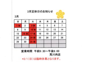 3月の毎週火曜日【3日、10日、17日、24日、31日】、第三月曜日【16日】がお休みとなります。